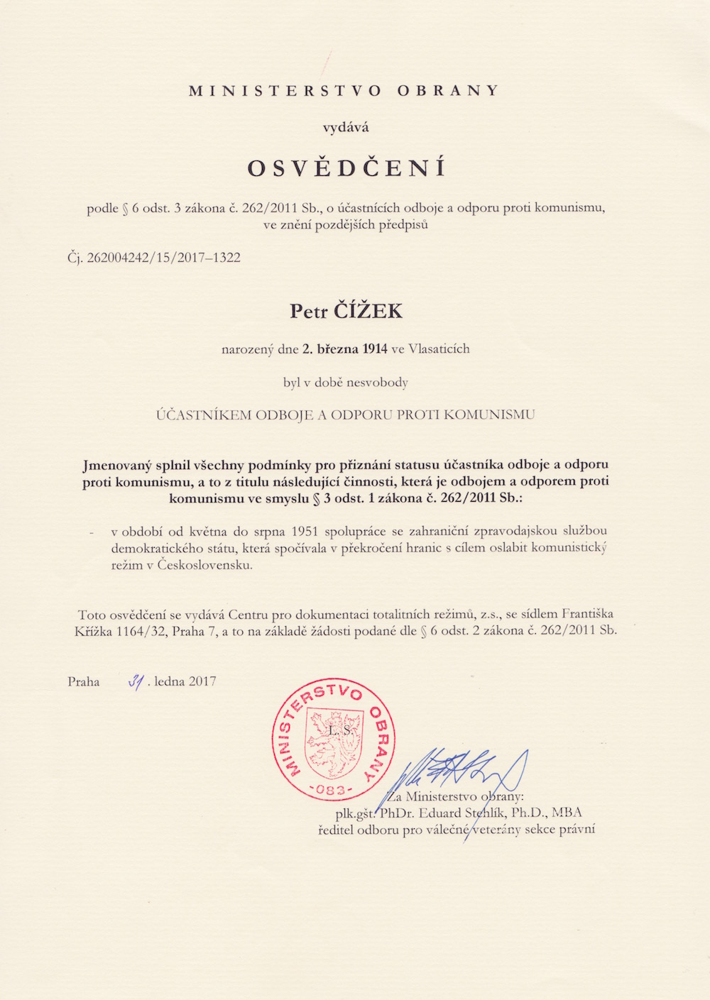 2. Petr Čížek, nar. 2. 3. 1914 ve Vlasaticích, čj. 262004242/15/2017-1322