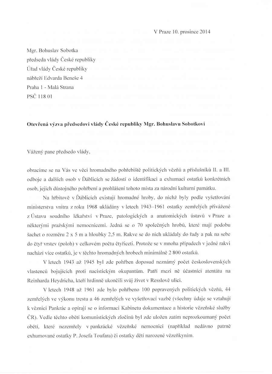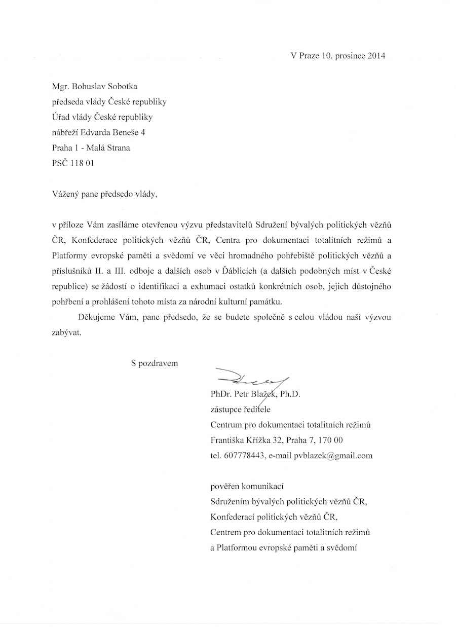 V prosinci 2014 jsme odeslali žádost předsedovi vlády ČR panu Bohuslavu Sobotkovi ve věci hromadného pohřebiště politických vězňů, příslušníků II. a III. odboje a dalších osob v Ďáblicích. Dopis byl podepsán představiteli Konfederace politických vězňů ČR, Sdružením bývalých politických vězňů ČR, Platformy evropské paměti a svědomí a Centra pro dokumentaci totalitních režimů. Dne 10. prosince 2014 byl Petr Blažek z posledně jmenované organizace hostem Studia ČT 24 na téma: Pohřebiště v Ďáblicích by mělo být prohlášeno národní památkou. O iniciativě přinesla zprávu také další média, která vycházela ze zprávy ČTK. Výzvu společně s odpovědí pana předsedy vlády publikujeme níže.