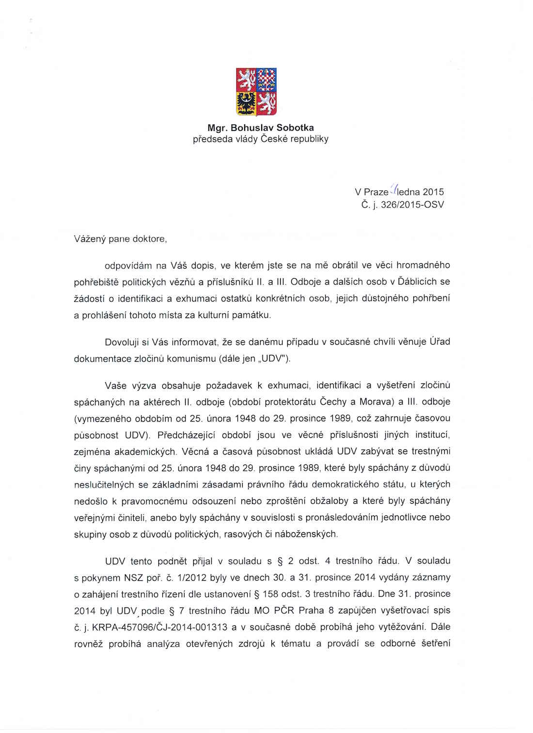 - Dopis předsedy vlády ČR Mgr. Bohuslava Sobotky (3. leden 2015)